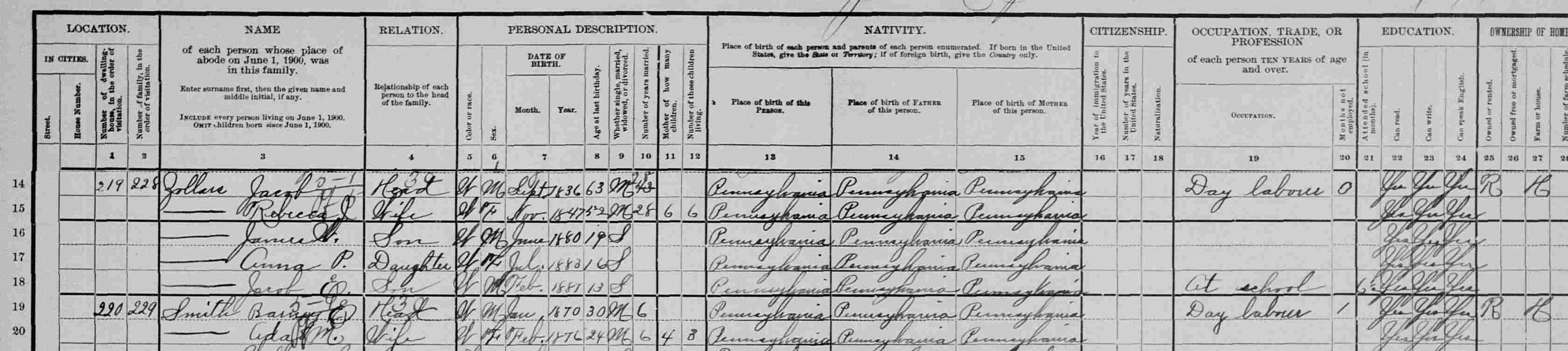 In this post I focus on Jacob Zollars, my grandmother’s grandfather. I learned a few details about Jacob from my grandmother: she would visit him and her step-grandmother in East Waynesburg; he spoke German or Dutch and she couldn’t understand what he was saying; at some point later in his life he visited each of his children for one month. I might have neglected to record other bits of information as this was all I could recall about Jacob. I wanted to know more about his life, so I turned to the census to see what information I could glean.