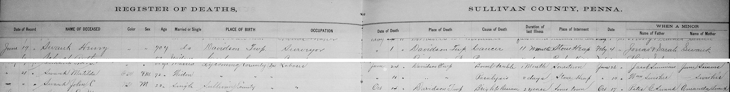 Occasionally these records will contain some gem of information. One example is Sullivan County’s death registrations for my paternal 2nd great grandparents. My ancestors, Henry and Matilda Swank died in 1901 and 1902, respectively. While perusing the book for their names during those years I came across Henry and a little further down on the page Matilda. As I read the information across the page I was surprised, and very much delighted, to see that their parents’ names were actually listed. For adults this is rare; parents are usually listed only for minor children. As I looked on some of the other pages I noticed that every so often an adult’s parents were named. Whether it was the recorder who asked or the person supplying information who added it, these gems help a genealogist to trace the family back further.