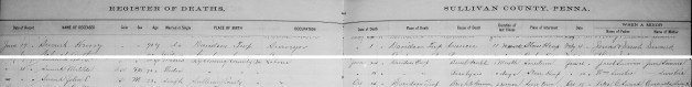 For those interested in searching PA records online, once at the FamilySearch.org home page, hover your cursor over the Search button at the top and from the list that appears, select Catalog or click here. For Search By, select Place and in the search bar type the county you wish to view, such as “Sullivan, Pennsylvania”. As you type a list of possible places will appear; select the county you want. For Search These Family History Centers: select Online and then click the Search button. This will pull a list of records grouped by type. For the death records expand the Vital Records grouping and click on the Register of Deaths which opens a new page. As you scroll down this page, look for a camera icon to click—this takes you to the images of the death registration book where you can flip through the pages in the comfort of your home. However, a camera with a key above it indicates that you must visit a local family history center to view those records.