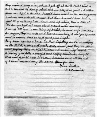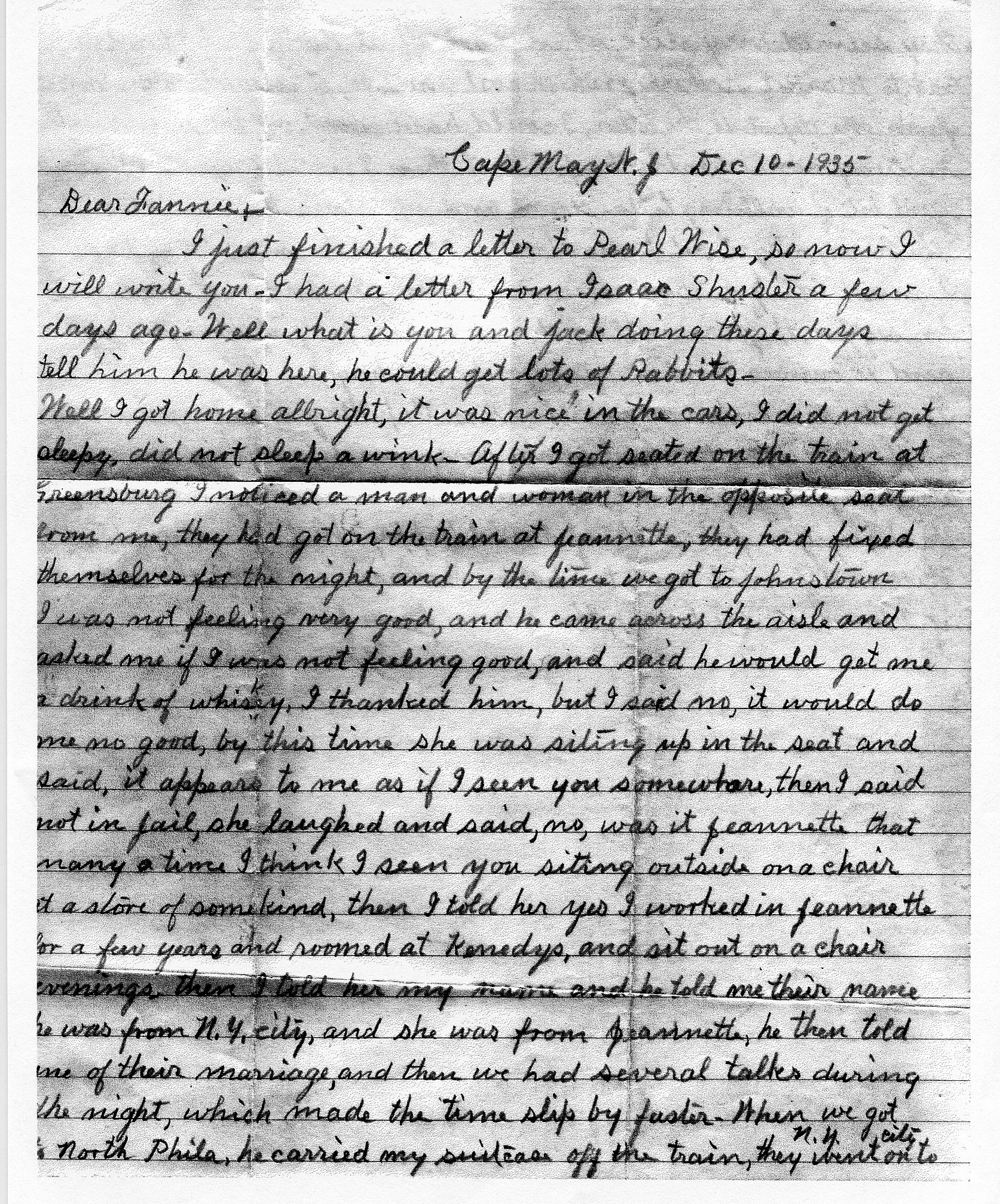 Several years ago a second cousin who had some family letters, gave me a photocopy of one written by Eden Ludwick in December 1935 before the holidays. Eden, brother of my great grandfather Alpheus, wrote to Alpheus’ widow. The train ride back to Cape May that Eden mentioned could have been from his trip for Alpheus’ funeral, which had taken place a few months before. Although his letter is simple, its details give insight into Eden’s personality and some events in his life.