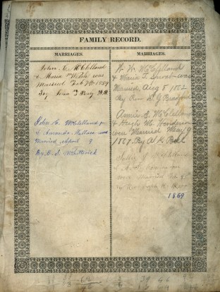 The first entry in the Family Register page listed that John C. McClelland and Maria Welsh married February 7, 1839 in Allegheny City, PA by Rev. John T. Pressly, D.D. Below this entry and on the next page were eight entries for the births of their children; all were born in Allegheny City, except for Sarah who was born in Lowell, Ohio. The children were: William Welsh, June 27, 1840; Sarah Jane, April 21 1843; Mary Ellen, May 11, 1845; Anna Eliza, March 8, 1848; Isabella Herron, August 29, 1850; John Crawford, September 10, 1853; James Bradford, March 1, 1857; and Josephine Campbell, January 16, 1864.