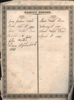 Turning the page revealed information on smaller pages and closer examination showed that these were loose pages from another bible, probably one that was older and falling apart. The entries on these pages were in different ink and were not all of one hand. Some of the information was a repeat of the neatly entered births of the other bible, but there were a few new names. It appears that these pages were from the family bible of Maria’s parents. Besides Maria’s marriage, Sarah Welsh was recorded as marrying Thomas Callahan on March 13, 1844 by Dr. Pressley, the same pastor that married Maria and John. Five of the Welsh children’s birth were listed: James Graham, November 12, 1825; John, October 2, 1828; John, September 4, 1831; Maria, February 2, 1821; Sarah, April 11, 1823. Several deaths were included as well: John, September 3, 1830 aged 1 year 11 months 1 day; John, November 16, 1832 aged 14 months 12 days; Nancey [sic], September 29, 1855 aged 62 years; Davidson, April 29, 1867 aged 75 years.