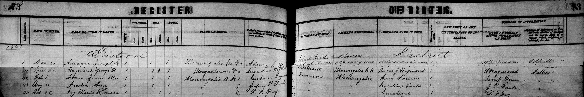 On my family’s Fowler line, John Fowler, the earliest Fowler ancestor identified thus far, settled in Monongalia County around the late 18th century when this area was still part of Virginia; during the Civil War this county became part of the new state of West Virginia. This county borders Fayette County Pennsylvania and it appears John’s descendants moved between the two counties and states. Fortunately, a number of these relatives lived in Monongalia County and they can be found in the birth registrations during the 19th century.