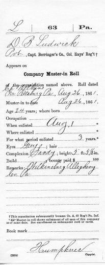 David resided in McKeesport just over a year longer until his enlistment with the Union Army on August 1, 1861 in Pittsburgh for a three year period; it is unclear whether he volunteered or was drafted. According to his pension file David was 24 years old from Wilkinsburg, Allegheny Co., PA at the time he went into the army. David had grey eyes, sandy complexion, and was 5’5 ½” tall. David was mustered into service August 26, 1861 as a private in Col. Hays’ 63rd Regiment, PA Infantry, Company A. Over the course of the war the 63rd lost 186 soldiers who died from combat wounds and 134 men who died from disease.