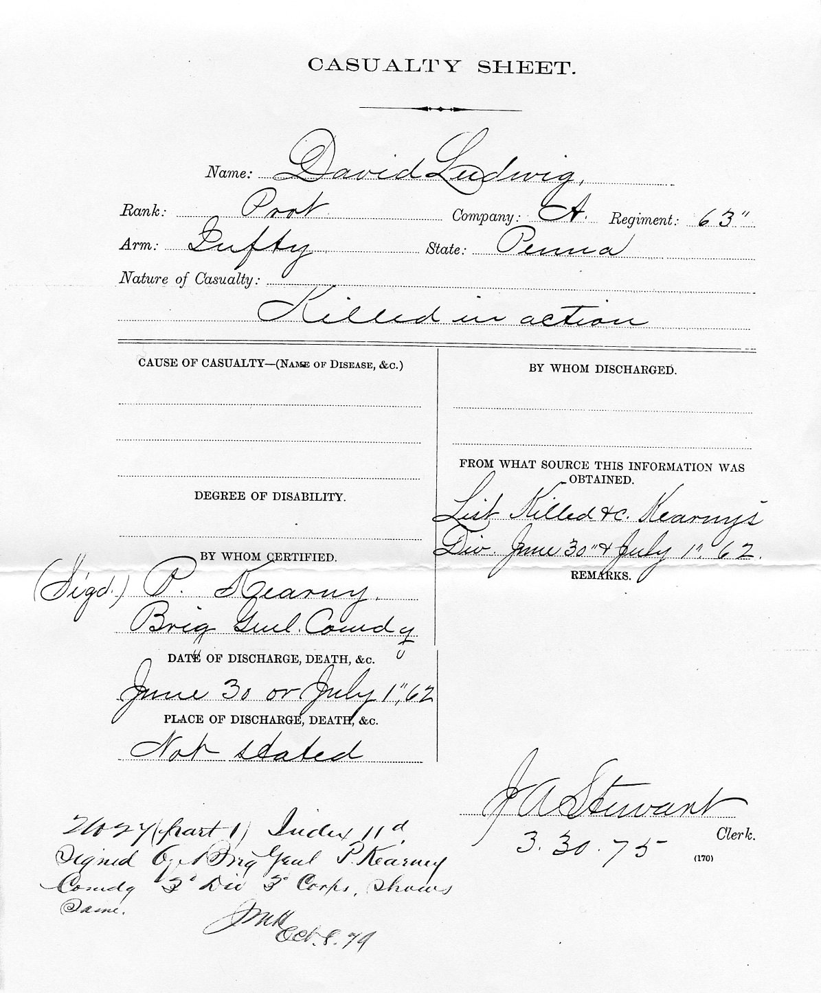 Wikipedia details some of the deployments for this regiment. They spent the first eight months defending the capital in Washington D.C. until March of 1862. Then the troops moved out and engaged in numerous combats, including the Battle of Williamsburg, Battle of Seven Pines, Battle of Fredericksburg and Battle of Gettysburg, among others. David was involved in the Seven Days Battles from June 25 to July 1, 1862, which was fought in Virginia near Richmond. On the sixth day June 30, 1862, David joined the ranks of the 297 killed during that day’s Battle of Nelson’s Farm. The Casualty Sheet in his pension file provided no additional information about his death or where he was buried, though it is possible David was buried in Glendale National Cemetery in an unnamed grave. This form was signed by Brigadier General Philip Kearny, who was killed in action two months later.