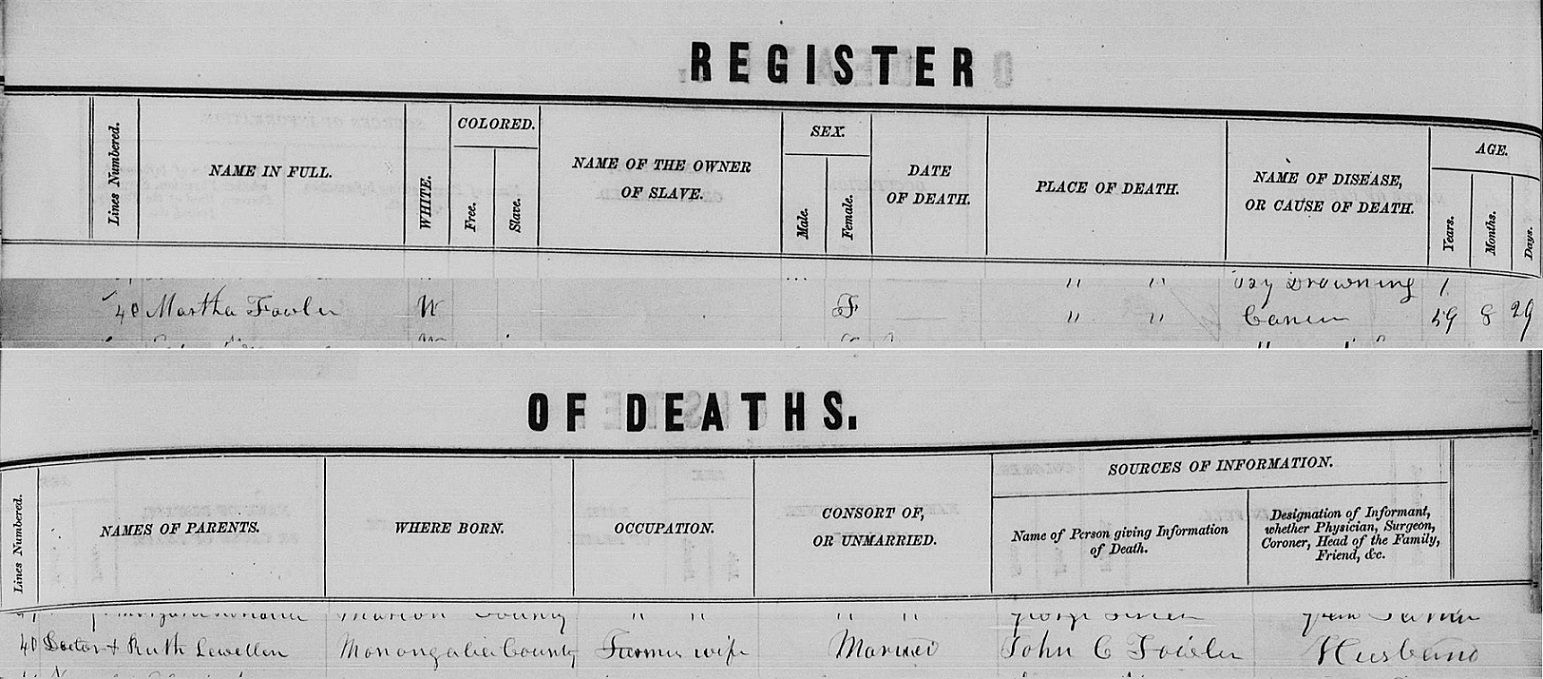 When I made my first research trip to Morgantown, WV, the county seat of Monongalia, I was researching my Fowler line. At the courthouse I was amazed to find records that extended so far back. Among some of the first pages in the register of deaths book, I came across Martha Fowler, who was my 3rd great grandmother, and the informant was John C. Fowler, her husband. To my delight, her parents, Doctor and Ruth Lewellen, were named, adding another generation to my tree. Martha died in 1853 from cancer; although her age was given, no death date was recorded. Locating a death date on her tombstone, I estimated her birth to be about August 29, 1793, using the age listed on her death record.