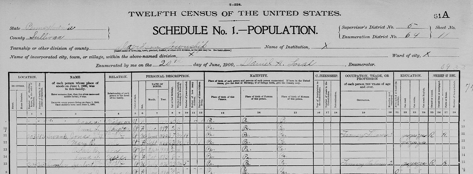 Jonas and Mary were enumerated in 1900 in Davidson Township. Most likely they lived in this township since their marriage. A newspaper mention in 1892 reports they hosted the marriage of Mary’s sister, Savilla to Isacc Flick at their home in Muncy Valley, part of Davidson Township.
