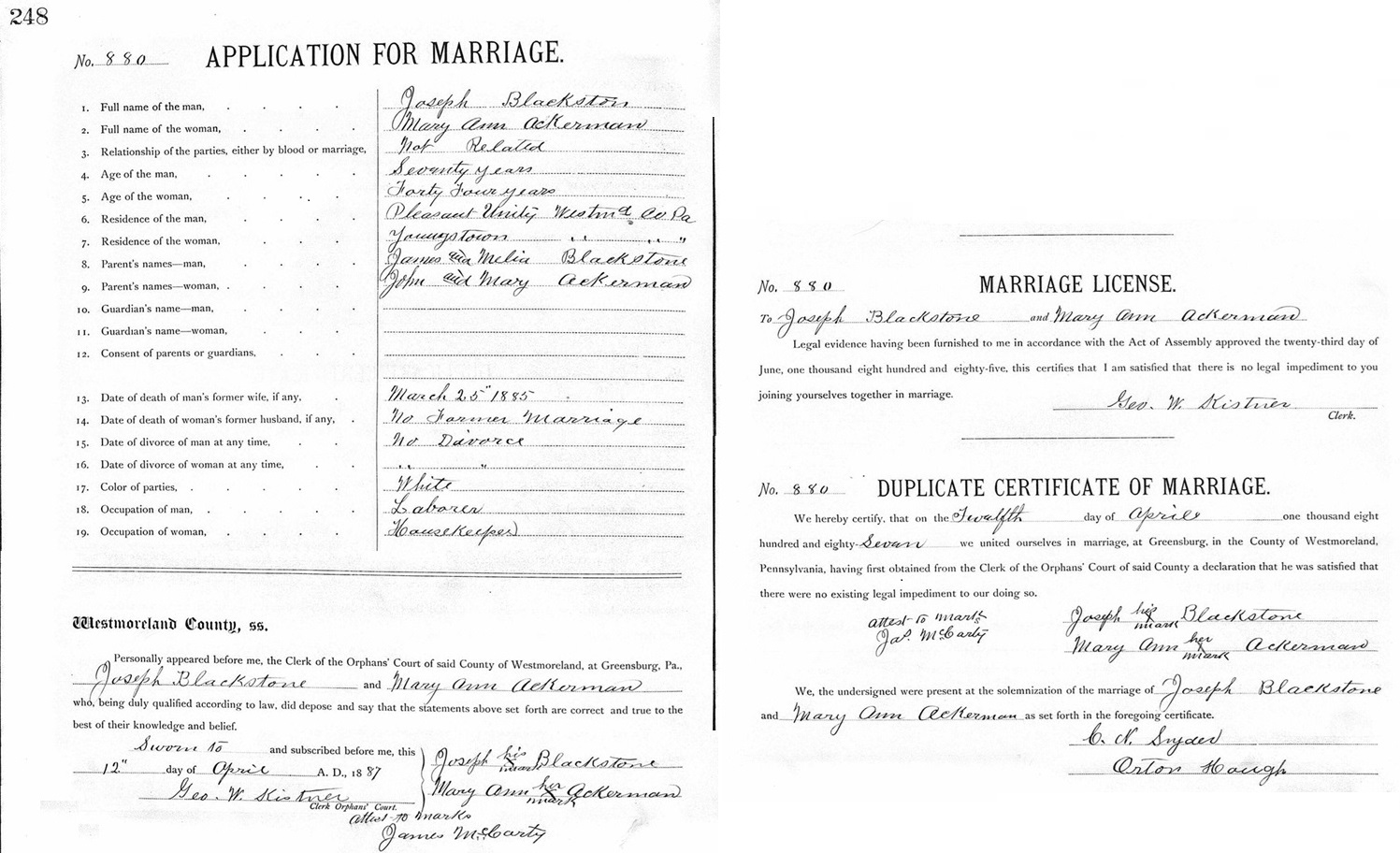 Because of this law, my 3rd great grandfather Joseph Blackston was required to obtain a license for his third marriage in 1887 in Westmoreland County. Joseph was 76 years old—although he was listed as only 70. His bride Mary Ackerman was 30 years his junior. Joseph’s marriage application is the sole document I have located that contains the names of his parents—James and Melia Blackston. Perhaps someday this information will prove beneficial in my quest to learn more about his mother, who died before Joseph reached adulthood.
